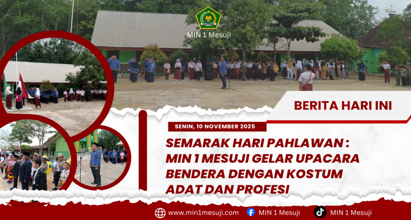 Mesuji, 10 November 2025 — Peringatan Hari Pahlawan di Madrasah Ibtidaiyah Negeri 1 Mesuji tahun ini berlangsung penuh warna dan gairah patriotisme. Alih-alih seragam sekolah biasa, lapangan madrasah diisi dengan barisan guru yang berwibawa dalam balutan seragam Korpri , disertai dengan siswa-siswi yang bertransformasi menjadi miniatur pahlawan masa depan dengan kostum profesi dan adat.